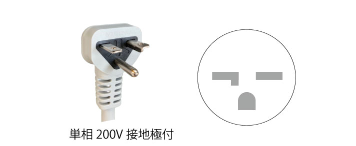 単相100Vは一般家庭でも使われますが、厨房機器は安全の確保のため接地極付になっていますので、接地極付のコンセントに差し込んでください。