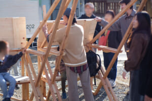 制作期間は11月8日から16日までの9日間。11月10日には参加学生が当社岡山工場を訪問し、社員へのヒアリングを実施。工場見学や社員の声を通じて得た洞察が、各チームの設計コンセプトに反映されました。11月15日には津山市内で成果発表会を開催し、各チームがプレゼンテーションを行いました。当社社員およびその家族も参加し、建築作品の意義や魅力を共有しました。