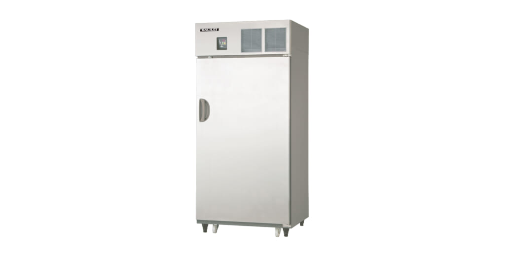 多目的保冷庫は、玄米や野菜などの鮮度を保つための業務用保冷庫です。重量物保管に適した頑丈設計とメンテナンス性を向上させるフィルターレス設計が特長です。今回のモデルチェンジでは、環境負荷の低いノンフロン冷媒R1234yfの採用に加え、省エネ性も向上させました。