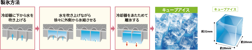 セル方式の自動製氷機です。不純物が少なく透明度の高いキューブアイスを提供します。