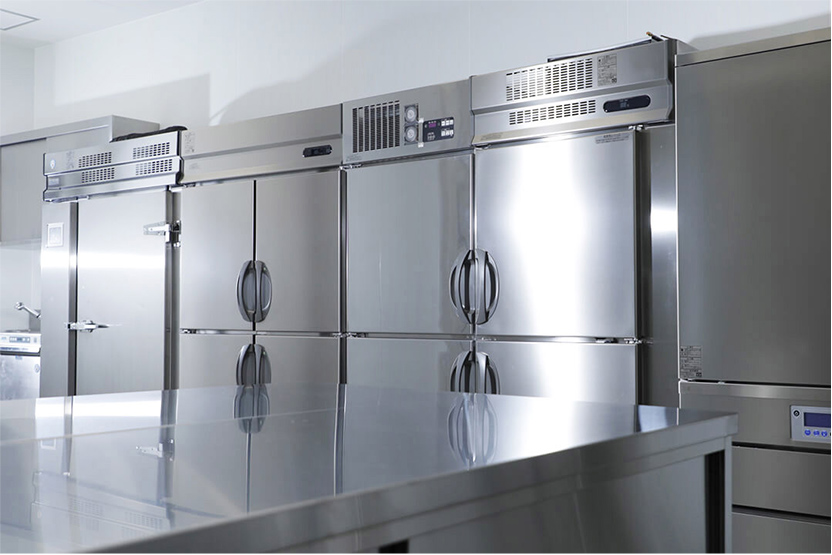 食品工場などで大量生産を行うトンネルフリーザやアルコール凍結機、大型ブラストチラー、プレハブ解凍庫などを完備。実際の生産工程を想定した食材試験や、冷却・凍結スピードの向上テストなど、導入を検討されるお客様とともに世界に1つしか無いオーダメイドのフリーザを作り上げていきます。