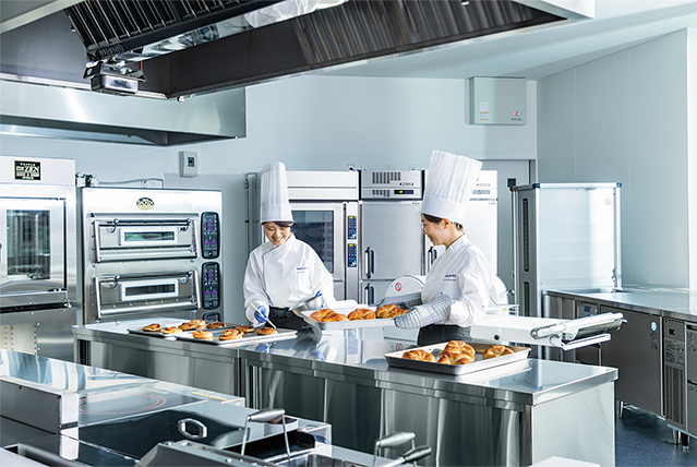 ベーカリー・パティスリーの専門ニーズに応える様々な厨房機器を取り揃えたキッチン。新メニューの開発や、発酵・焼成・冷却・冷凍テストも行え、最適な機種選定に活用いただけます。ベーカリー・パティスリー講習会や勉強会にも対応します。