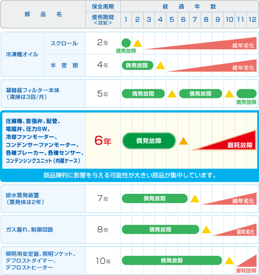 冷凍サイクルを構成する部品・送風機・電気・電子部品等は徐々に劣化します。